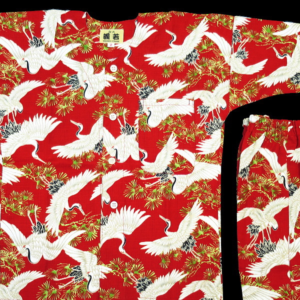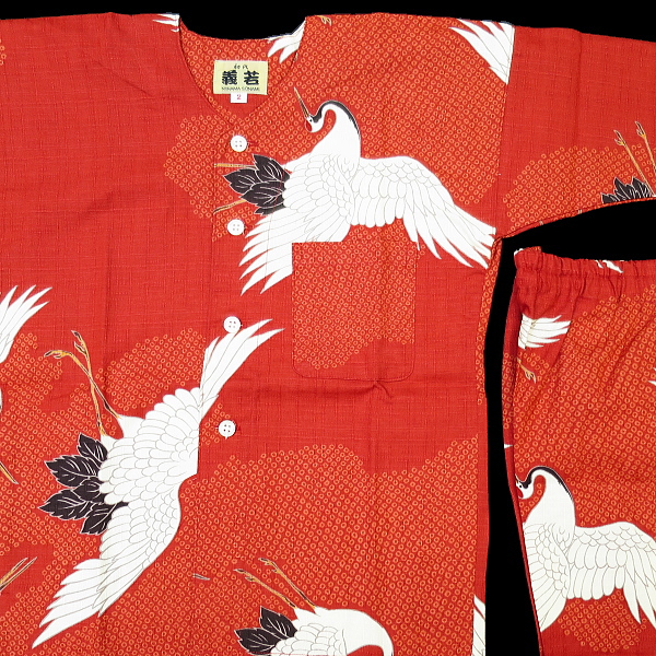 koi-045 飛翔鶴と松(赤)子供鯉口シャツ上下セット 綿100%