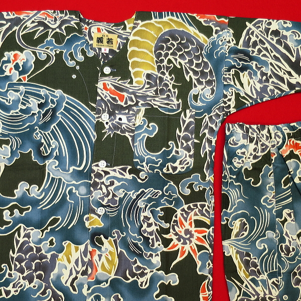 koi-063 大荒波に龍(渋緑)子供鯉口シャツ上下セット 綿100%