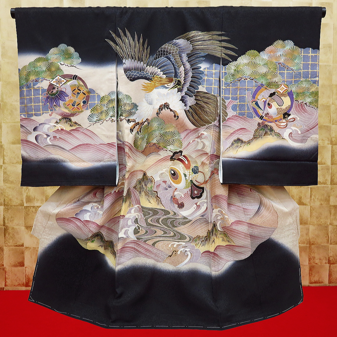黒地の御着物に波涛と大きく羽ばたく鷹を描きました。