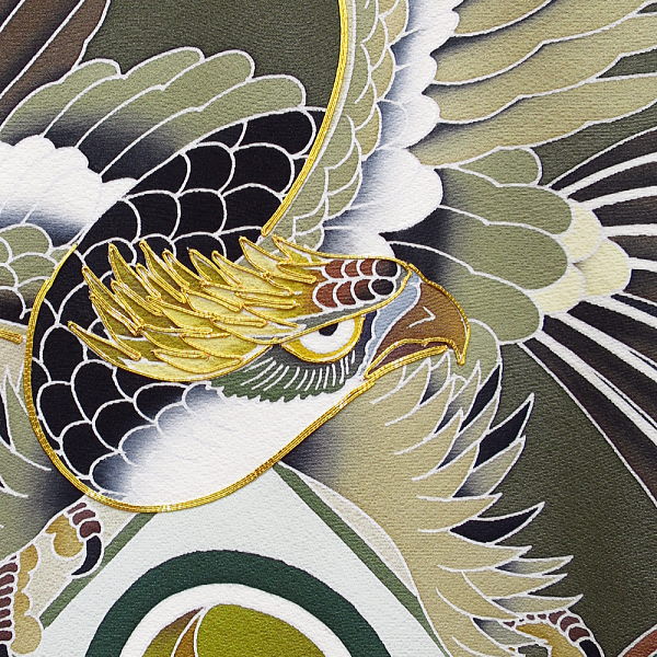 渋抹茶緑色に雲どりのデザインの中にお目出度い柄がたくさん描かれ、とても上品な逸品に仕上がっています。