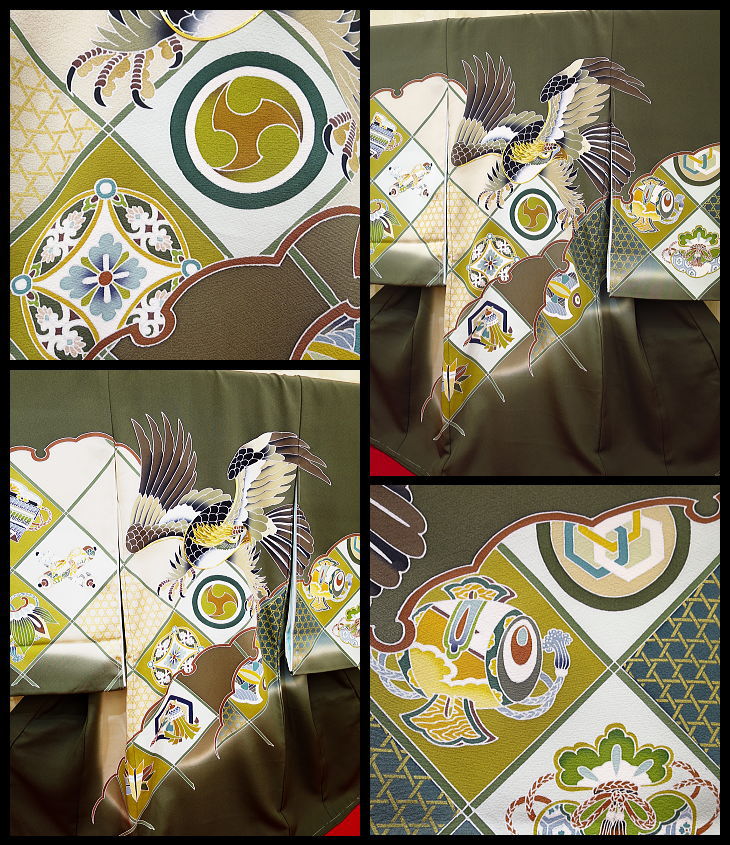 ubugi-2914 【雲どりに飛翔鷹・渋抹茶緑】 初着 祝着 男の子のお宮参り着物 高級フードセットプレゼント付